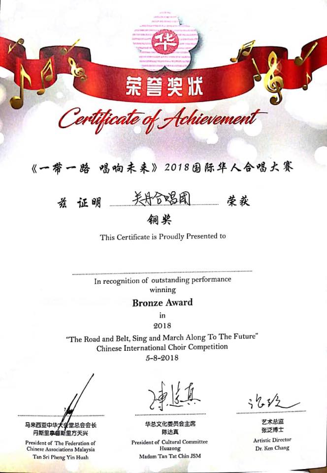 ‘The Road and Belt, Sing and March Along To The Future’ – Chinese International Choir Competition; held on 5th August 2018 at Kuen Cheng High School, Kuala Lumpur. Well done to Kuantan Chorus members (awarded Bronze)and to all participants.